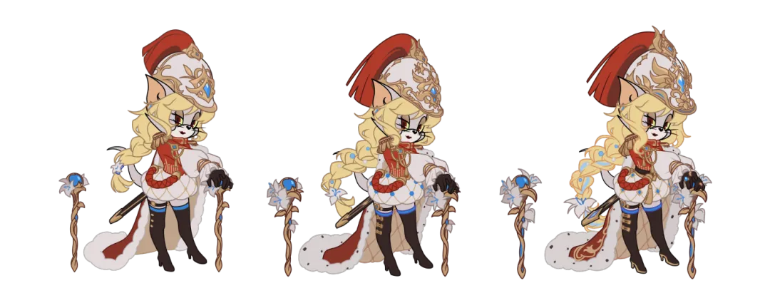整个皮肤采用红白为主色调,在大家一贯认知的锡兵基础上进行了创新的设计, 以白百合与蓝宝石的元素加以点缀,塑造了一位刚中带柔,卓然独立的女锡兵将领。