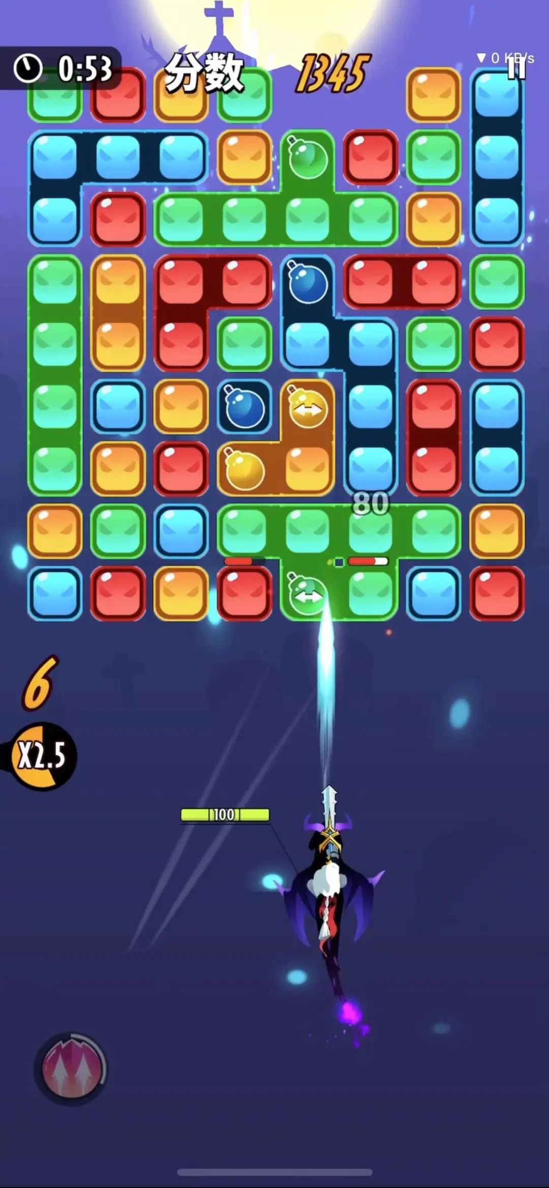 4、在消灭相连史莱姆获得一定连击层数时,将可以释放技能,进入强化状态,得到大幅增强,弹道变为两个且攻速提高。持续打出三消时,获得积分翻倍,最高为11.5倍。
