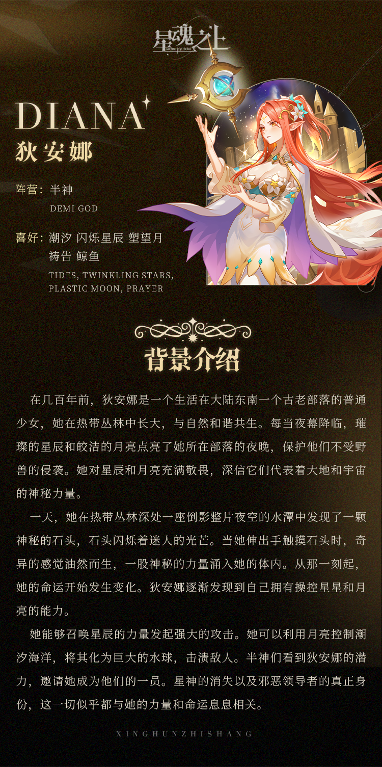 当夜幕降临,宇宙中的星星开始绽放,犹如点点闪烁的珍珠撒落在无垠的黑幕上。这无垢的夜空是内心的静谧之所,每一颗星星都是一颗灵魂的火花,狄安娜在它们的微光中,寻找着生命的奥秘。大海的涛声在远处轻轻响起,像一曲永恒的旋律,回荡在心灵的深处。潮汐的涨落仿佛是宇宙的呼吸,每一次的涌动都是生命的节奏。当平静被深渊打破,狄安娜将与半神们一起为星魂大陆带来永恒的和平与光明。
