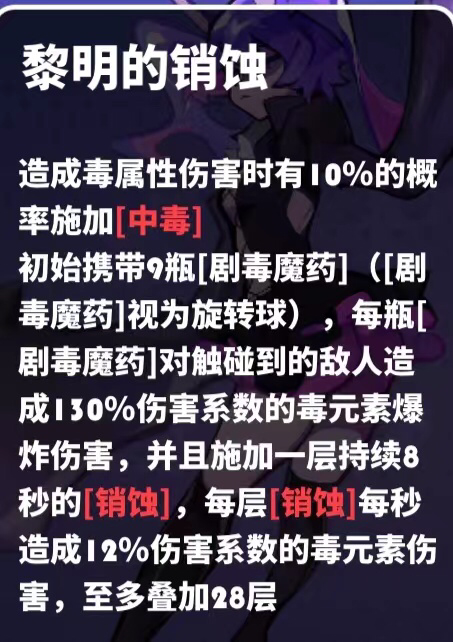 每次旋转球爆炸就叠加一层[销蚀],上限为28层,每秒每层[销蚀]有12%的伤害倍率([销蚀]造成的伤害无法暴击!)