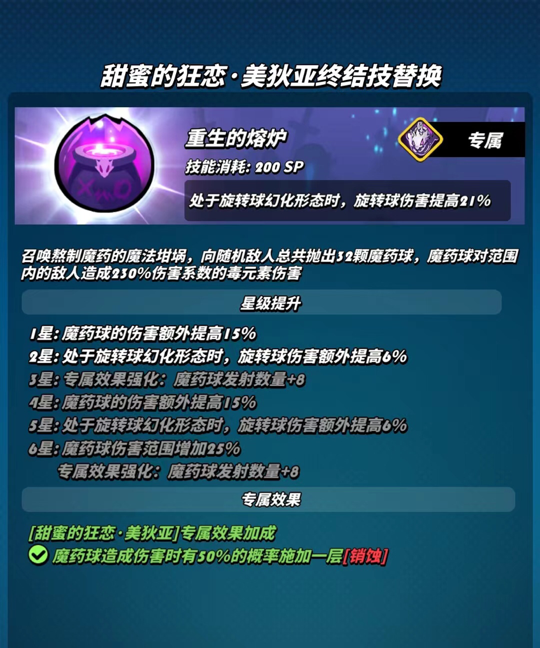 美狄亚的终结技能造成6900%倍率的毒元素对小群伤害,专属效果对没有旋转球羁绊时的美狄亚有些许提升,但对于有旋转球羁绊时,提升几乎没有