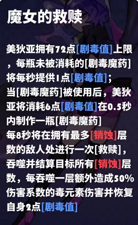 4、美狄亚在当前环境中是无弹幕赛道的最优选择之一(另一个是波琳娜),无论机制与数值都是无与伦比的顶尖存在,自由调配的循环手法,选择多种多样,且在少量弹幕环境中也可以将吞噬反击融合进自己原本的流程中。唯有在弹幕环境中美狄亚会因为吸弹幕而打乱输出节奏导致剧毒值供不应求或溢出。其他环境中,无论对群/对单/打boss,美狄亚都能游刃有余。