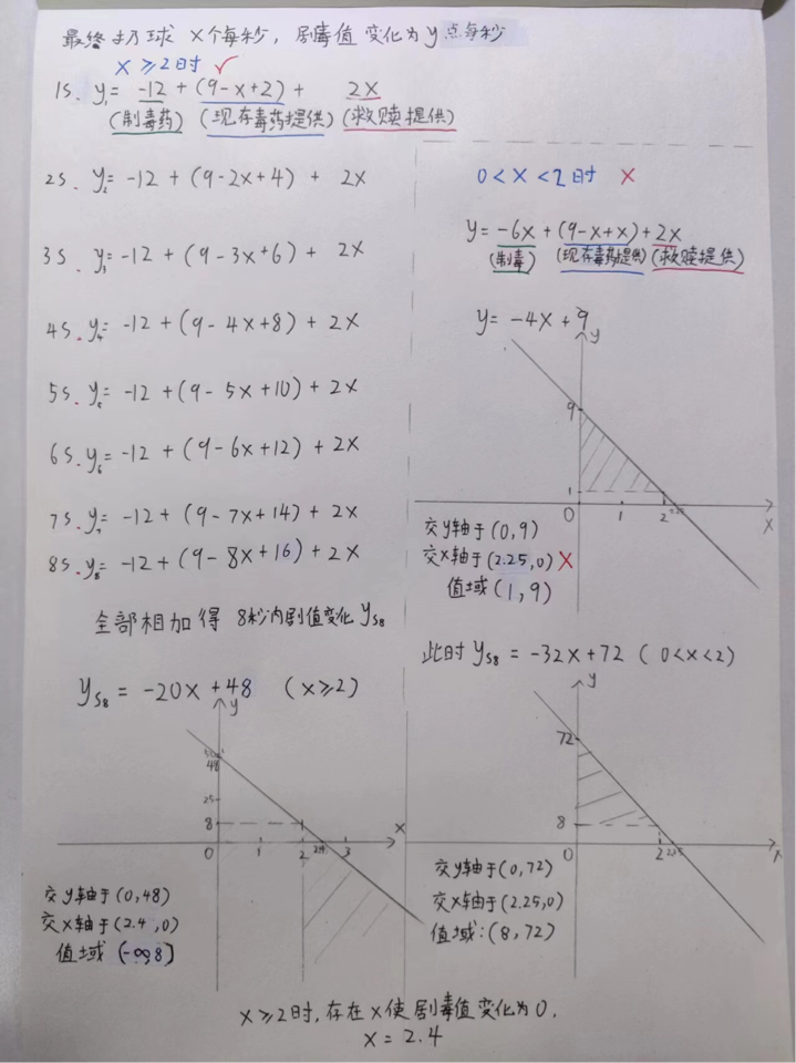 药瓶产出数量计算:在得到剧毒值与每秒抛出的药瓶的关系后,只要找到平衡点,即两者相等时,每秒抛出多少瓶即可