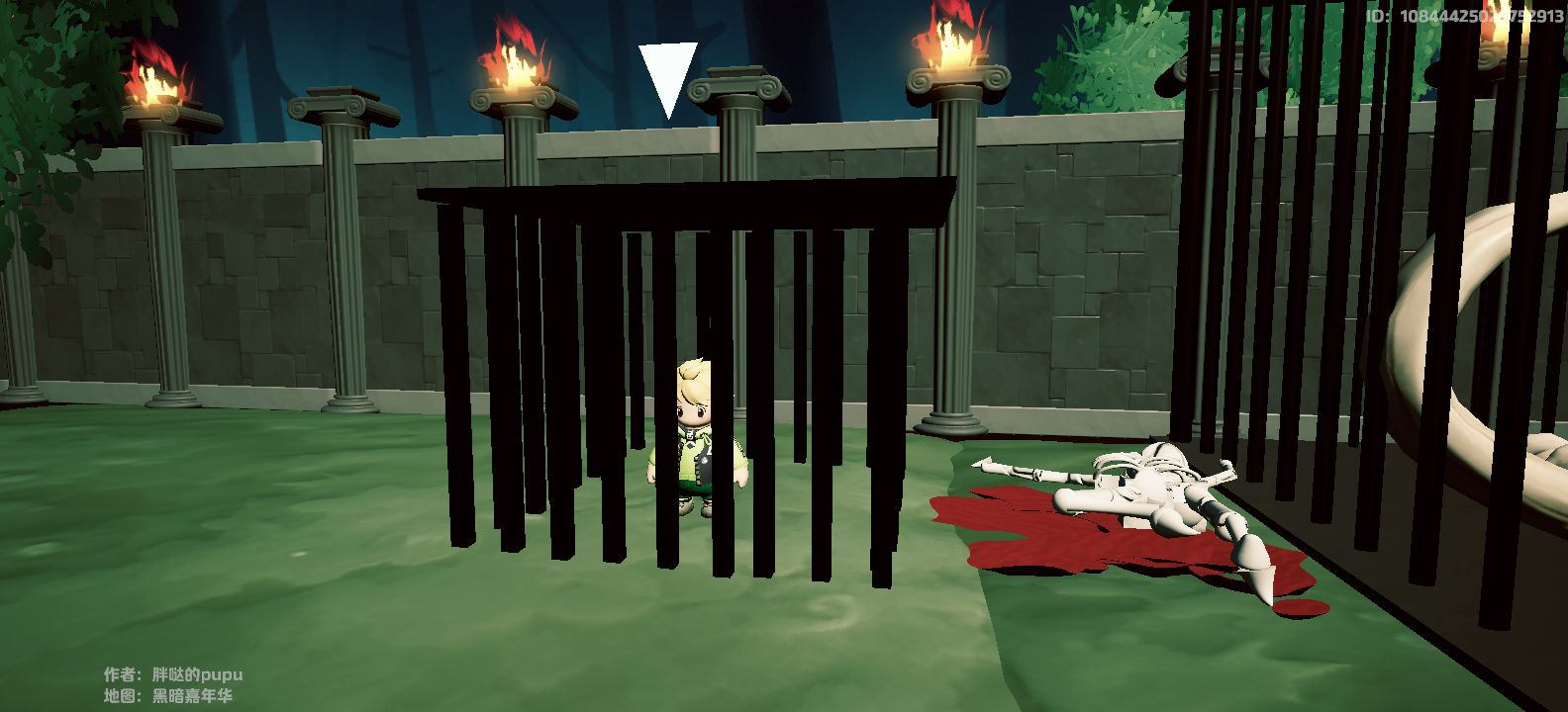 既然后退无门,不如大胆探索,星妹走到游乐园右侧的墙边,在一个偌大的铁笼子里发现了被小丑关住的小A。笼子旁有一具不知什么生物的骸骨和干涸的血迹,这里究竟发生过什么?