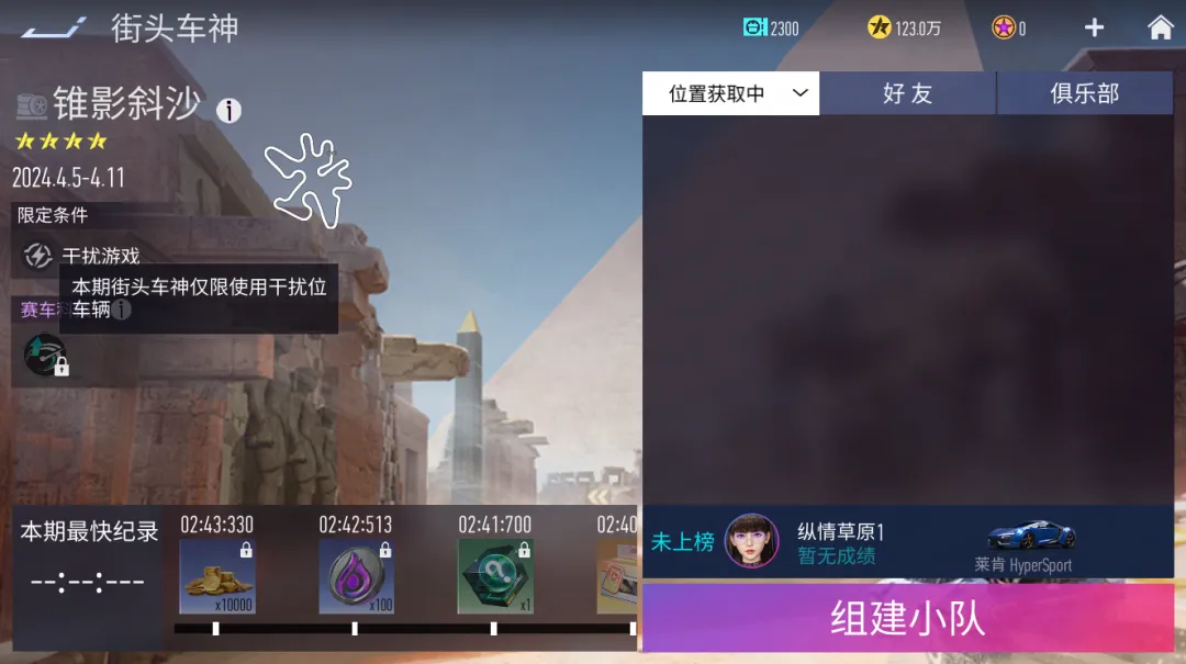 街头车神『锥影斜沙』将于2024年4月5日8:00开启。本期街头车神仅限使用干扰车。
