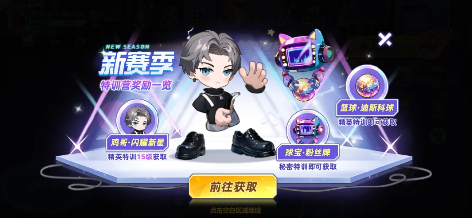新赛季的特训营已经准备就绪,你可以解锁鸡哥皮肤·闪耀新星、篮球·迪斯科球、球宝·闪耀粉丝牌等令人心动的特训营奖励。