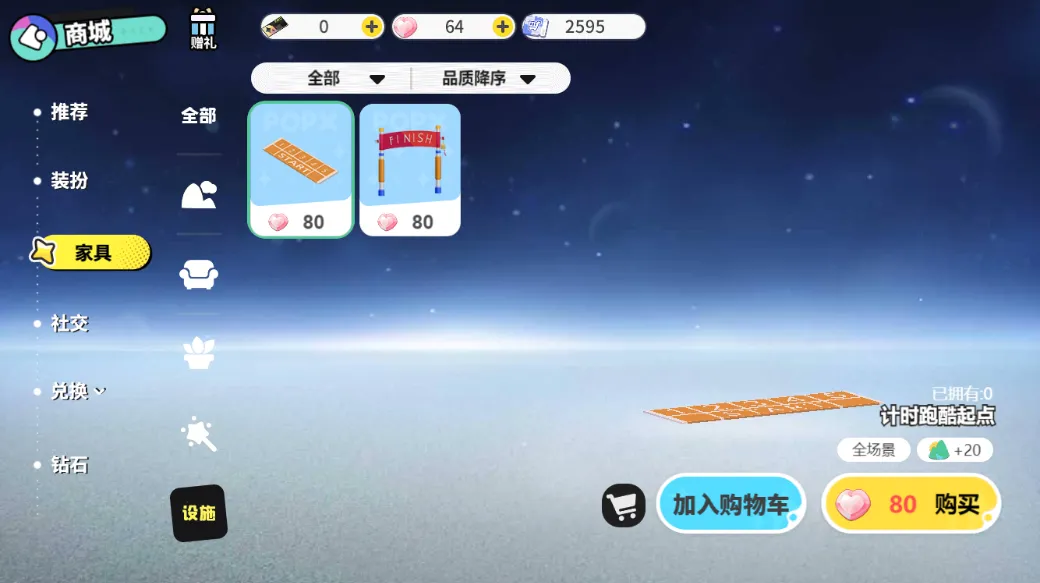 购买设施后在装修界面摆放出来就可以啦,家园摆放了计时跑酷起点、计时跑酷终点时即使跑酷生效。