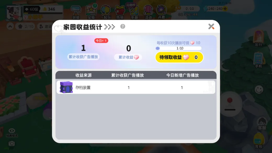 在自己的家园内与存档设施交互,就可以查看家园收益统计。