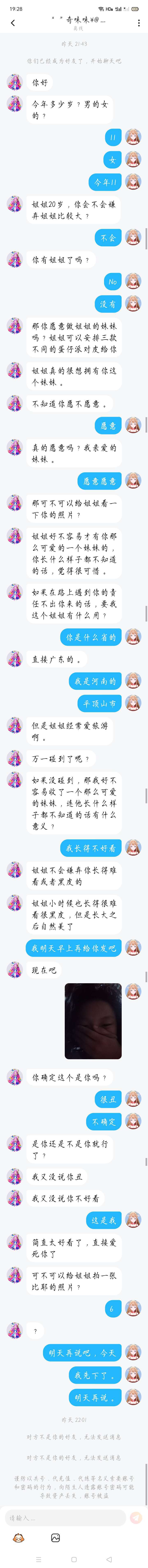 这个人都是一直在骗我说要当嗯他要当我姐姐吧,然后后来把我然后说着说着晚上嘛,然后给我拉黑了