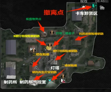 推荐路线:制药所→监控室→灯塔→灯塔前方和左方房屋二楼保险箱→民居房保险箱钥匙