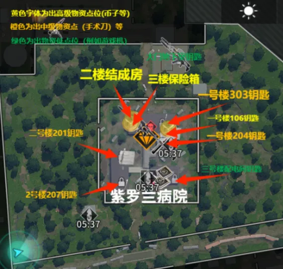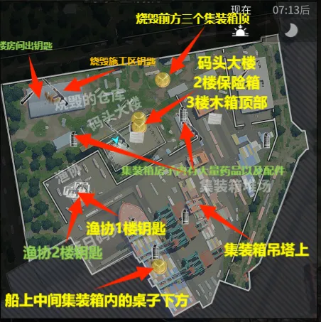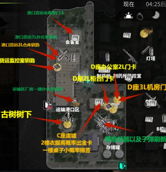 施工区钥匙房刷新金雕和大金;废楼三层和渔协二层都会有小金,集装箱货堆上有概率刷新隐藏保险箱,隐藏保险有概率刷新数字币。大家在这个区域作战的时候可以优先占领废楼三层,是这个区域内最高的建筑,能看到别的玩家和战场信息,或者占领地图边缘铁道旁的大仓,大仓的房顶是可以上去的,也是一个不错的位置。