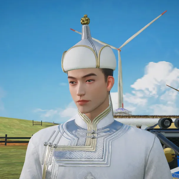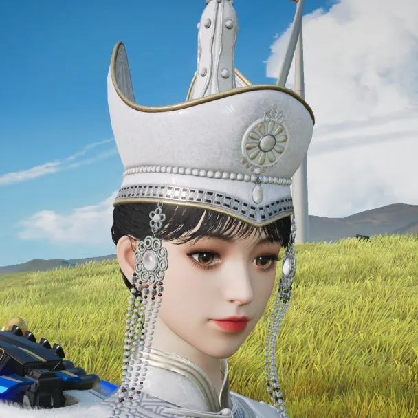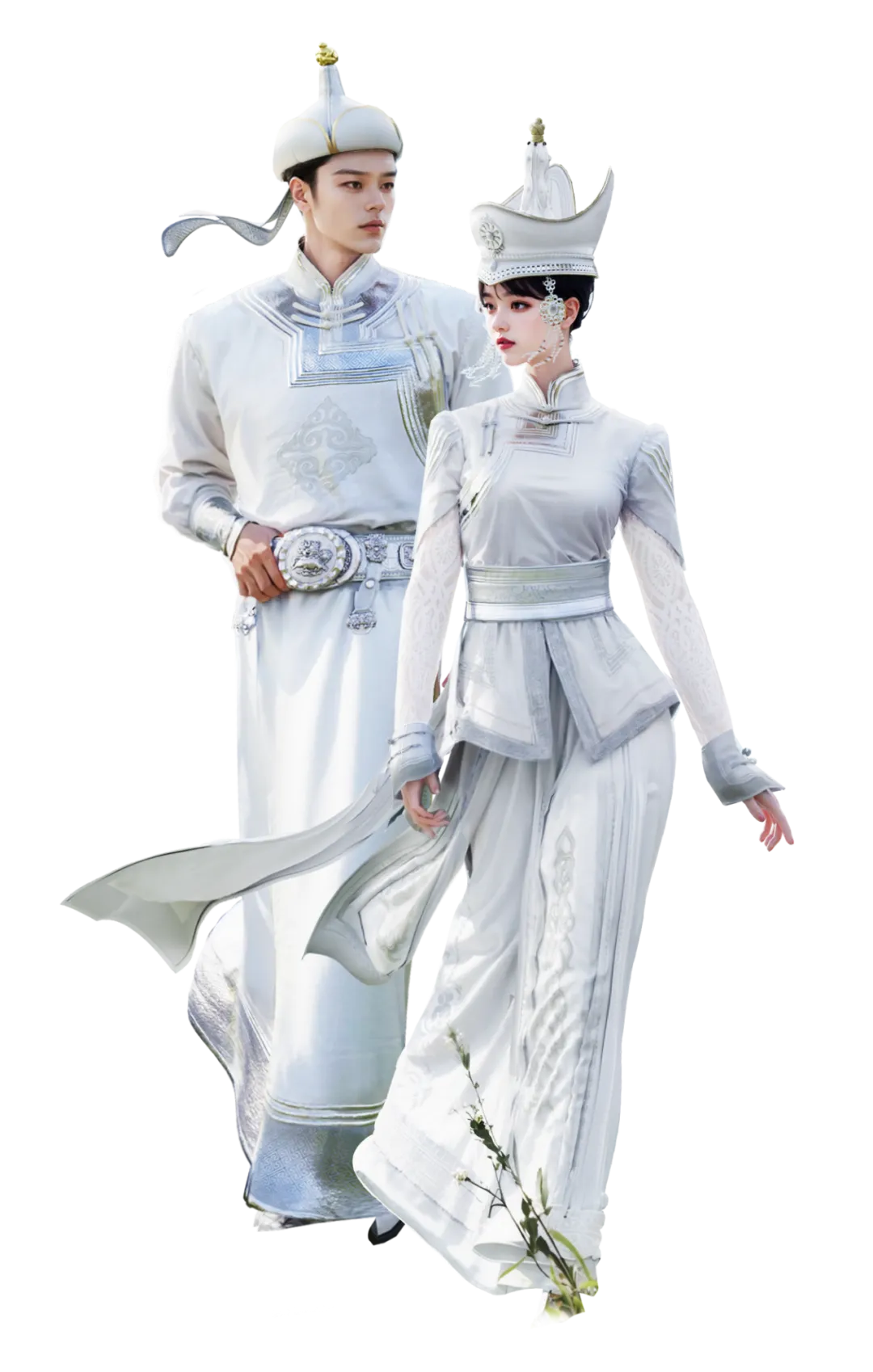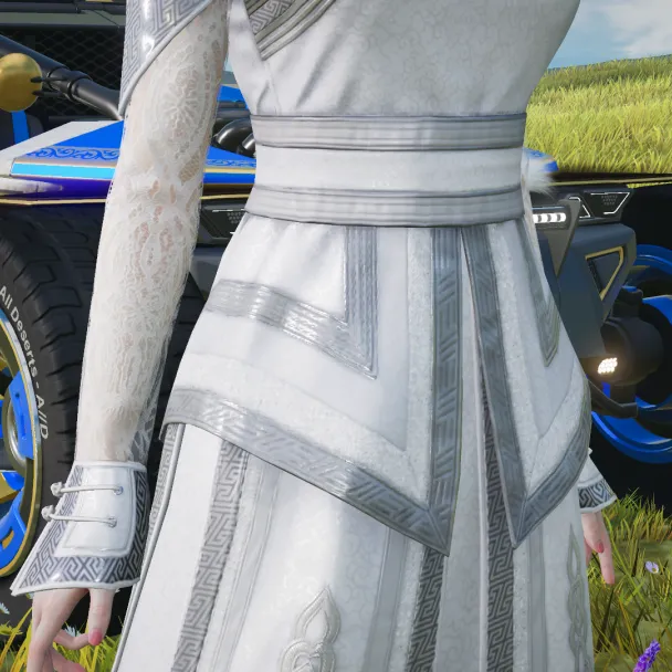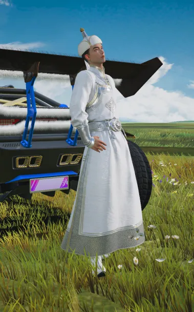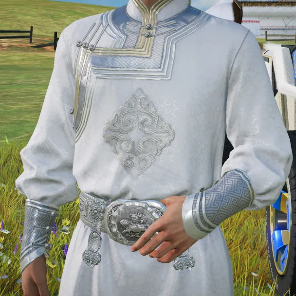 自古以来,在蒙古族文化里白色都代表者纯洁和吉祥。因此,这套改良款的蒙古时装在配色上便也以无暇的白色为主色调,女款时装冠帽旁垂挂而下的链状珠宝装饰同样选用了白色,希望能向车手们传递来自草原的幸福美满的祝福。
