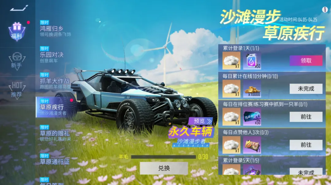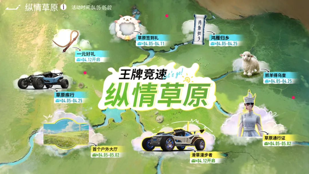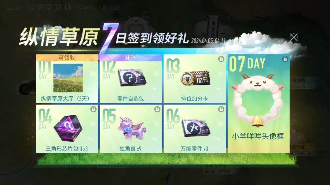4月5日-4月11日,车手们每日签到都能领取对应奖励,除了游戏道具与可爱的小羊咩咩头像框外,还能解锁全新纵情草原大厅使用特权,将草原风光直接搬进车库,随时随地拥抱广阔自然,氛围感直接拉满!