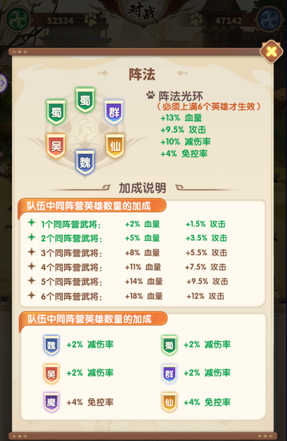 【阵法了解】 新手主公进入游戏可以先跟随着主线进行完成人物,前期的游戏还是 相对于来说比较简单的,只需要跟随引导了解游戏内各个功能即可,主要需要了解的就是游戏内的阵容搭配以及各个猫猫神将的技能以及属性,在推图和PVP战斗时可以看下右上方的阵法属性,上满6个神将可以获得阵法光环,对于推图和PVP战斗都有着不小的帮助!
