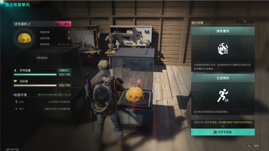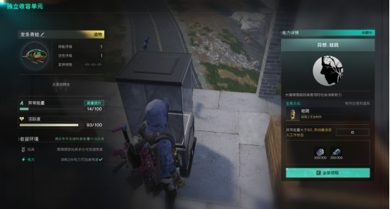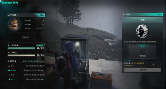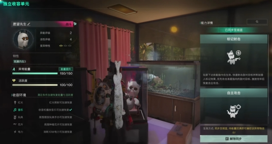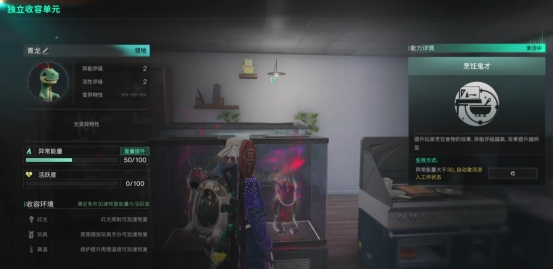 对着“独立收容单元”打开收容界面,左侧会显示异常物的基础信息,包括异常物的异常能量、活跃度和收容环境,界面右侧是异常物的能力详情,超越者们可以在这里将它们同步至摇篮、收集工作产物、或是调整它们开工所需的异常能量数值。