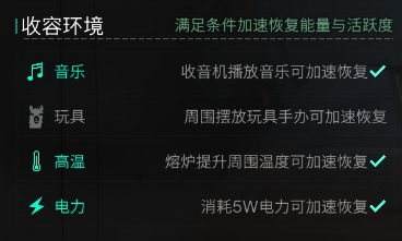 不同的异常物对收容环境有不同的要求,超越者们只需满足部分条件就能有效提升异常物的能量恢复效率,全部满足的话则效率最高。