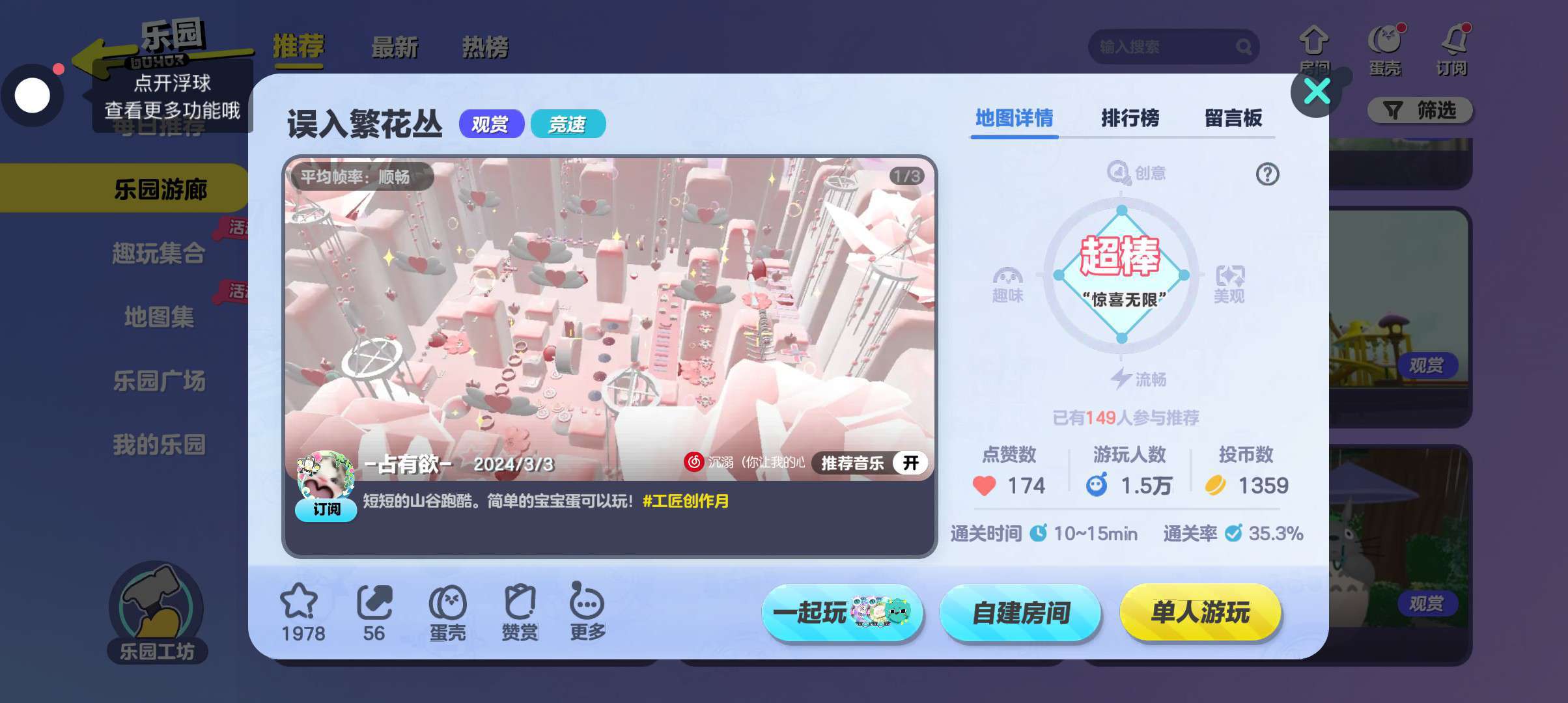 嗨 大家好 我是悦恋 万年不更新的我也是来更新了 因为我懒 不想更新 Ok啊 进入主题推荐地图 给大家介绍一下地图吧 整体由粉色构成少女心的宝子可以玩一下 也不算很难 不到半小时就可以过去了 通关率也非常的高 关卡也不那么难 所以心动不如行动 快来试一试吧❤️❤️❤️