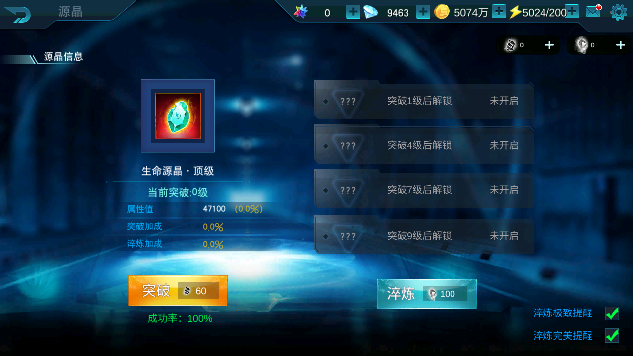 源晶突破系统,源晶升至满级后,进入突破页面,对源晶属性进行淬炼,属性加强。
