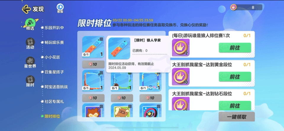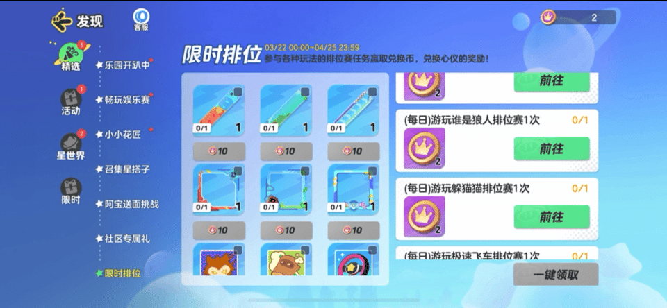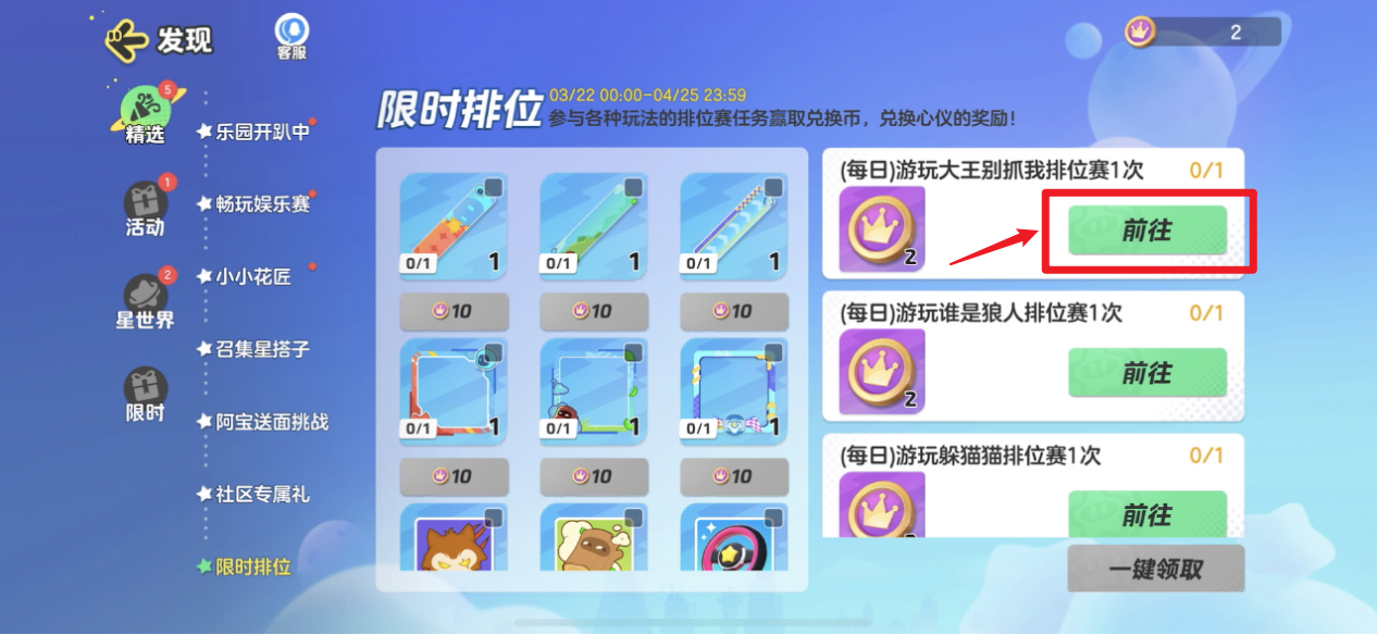 限时排位的活动时间为3月22日-4月25日23:59。星宝参与各种玩法的排位赛即可完成任务,赢取兑换币,用来兑换心仪的奖励!划重点!!星宝点击活动右侧的【前往】就能一键跳转到对应的玩法界面,开启任务咯~