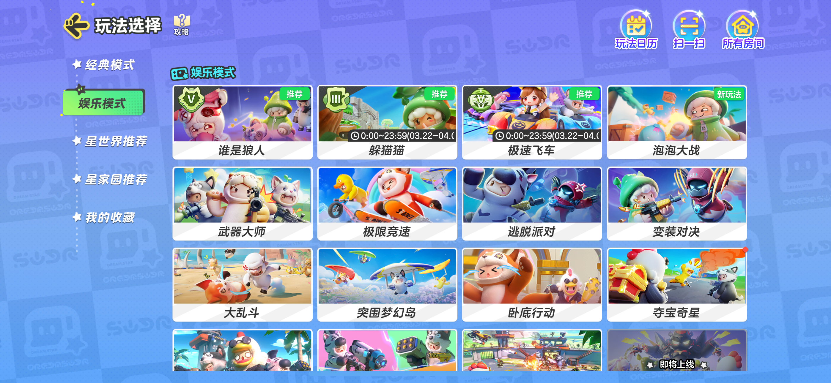 喜欢冲分竞技的星宝有福啦!除了传统的经典排位赛以外,娱乐模式中的谁是狼人、躲猫猫、极速飞车,以及大王别抓我玩法都开启了排位赛玩法。元梦中的【限时排位活动】还给各位星宝们准备了丰厚大礼,快和星妹一起康康吧(✪ω✪)