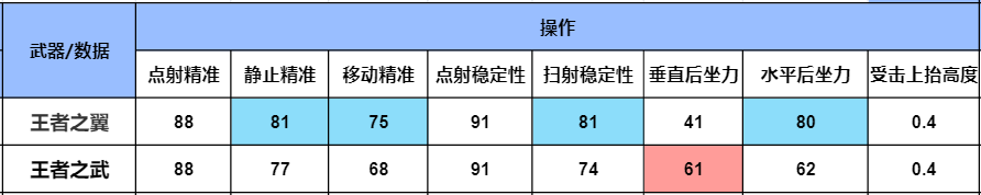 在操作上,王者之翼和王者之武的点射精准、点射稳定性和受击上抬高度是一样的,都是拥有较高的点射稳定性,同时在静止精准、移动精准、扫射稳定性和水平后坐力上王者之翼要略优秀一些,这些也造就了王者之翼在实战中的地位,不过王者之武的垂直后坐力要高于王者之翼,这样一来王武的稳定性也要高一些。