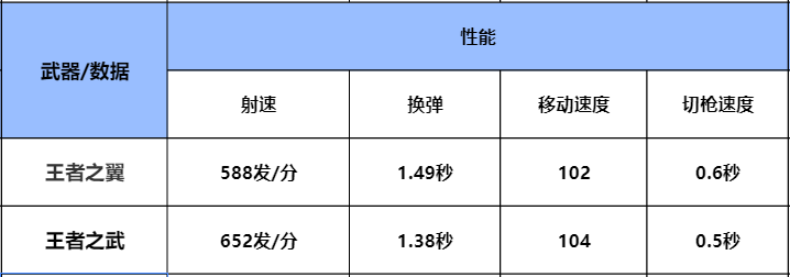 王者之翼在性能上稍微略逊于王者之武,不管是射速、换弹、移动速度还是切枪速度,都要低于王者之武,所以王者之武射速高就能弥补伤害低的缺点,只要玩家速点够快,也能轻松带走敌人,而且王者之武的移动速度还要比王者之翼快一些。