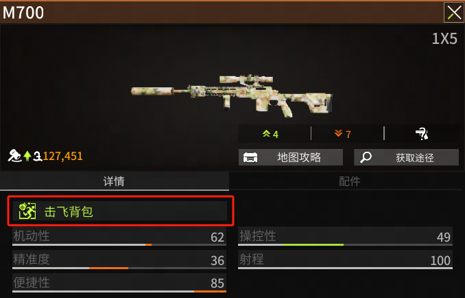 M700击飞背包的特色属性无疑为萤火虫们带来了全新的战术体验,它可以让各位在击中敌人的瞬间一枪即能打飞对方的背包。无论是隐藏在高山之巅,还是潜伏在密林深处,只要心存相信,M700就有奇迹!那些低打高、看似不可能成功的掠夺,在M700面前都变得轻而易举。利用好击飞背包的属性,杀对手一个措手不及!在敌人一脸懵逼是捡包还是对枪之间轻松赢下战斗的胜利!犹豫就会败北!