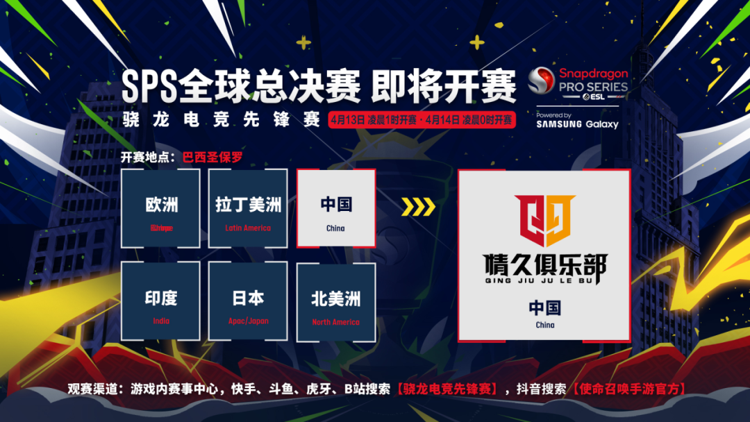接到情报,本年度首场国际赛事——骁龙电竞先锋赛·全球总决赛即将于4月13日(本周六)在巴西圣保罗开赛!情久战队将代表国服赛区出征!