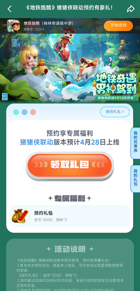 预约《地铁跑酷》联动版本后,截图发帖至游戏圈,并带上话题“男神驾到#”与自己的版号,就有机会获得我们丰厚奖励哦(~ ̄▽ ̄)~