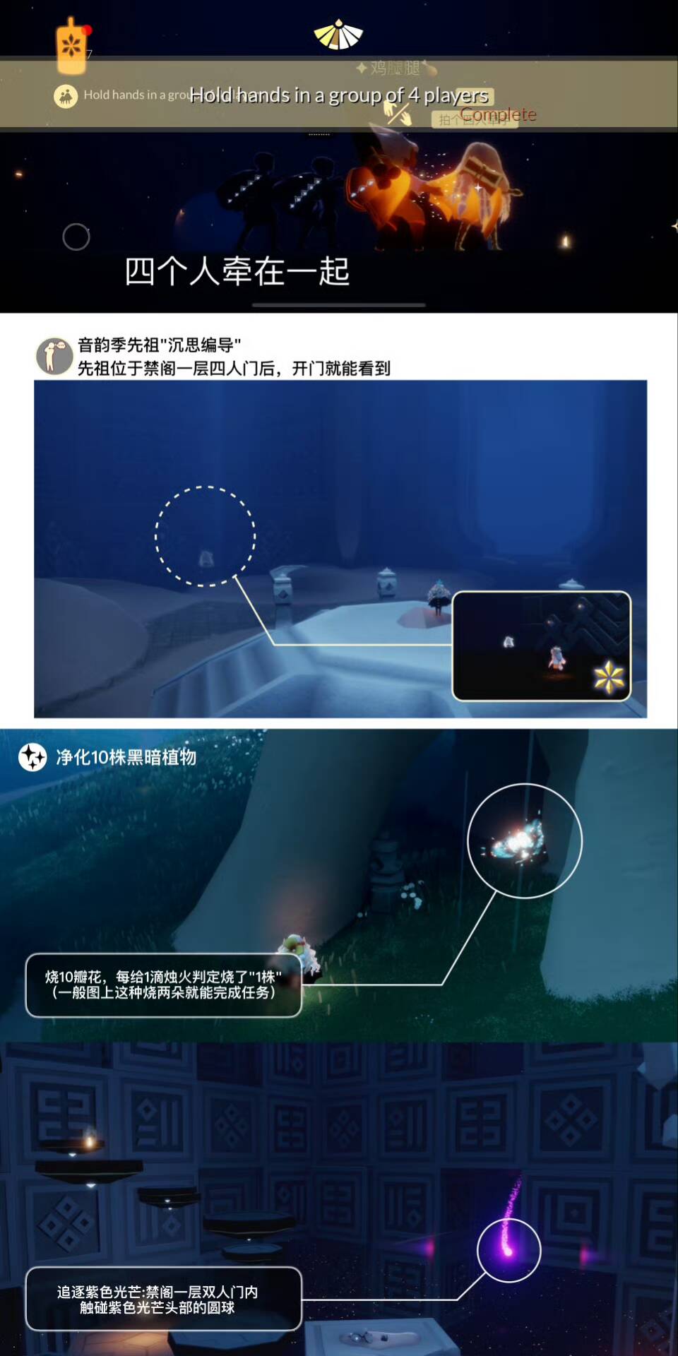 「四人牵手组队」四个人牵在一起,也可通过在【霞谷表演季剧场右边洞口的火盆旁】或【禁阁庇护所向导对面方罐子旁】打坐重温对应季节任务完成。