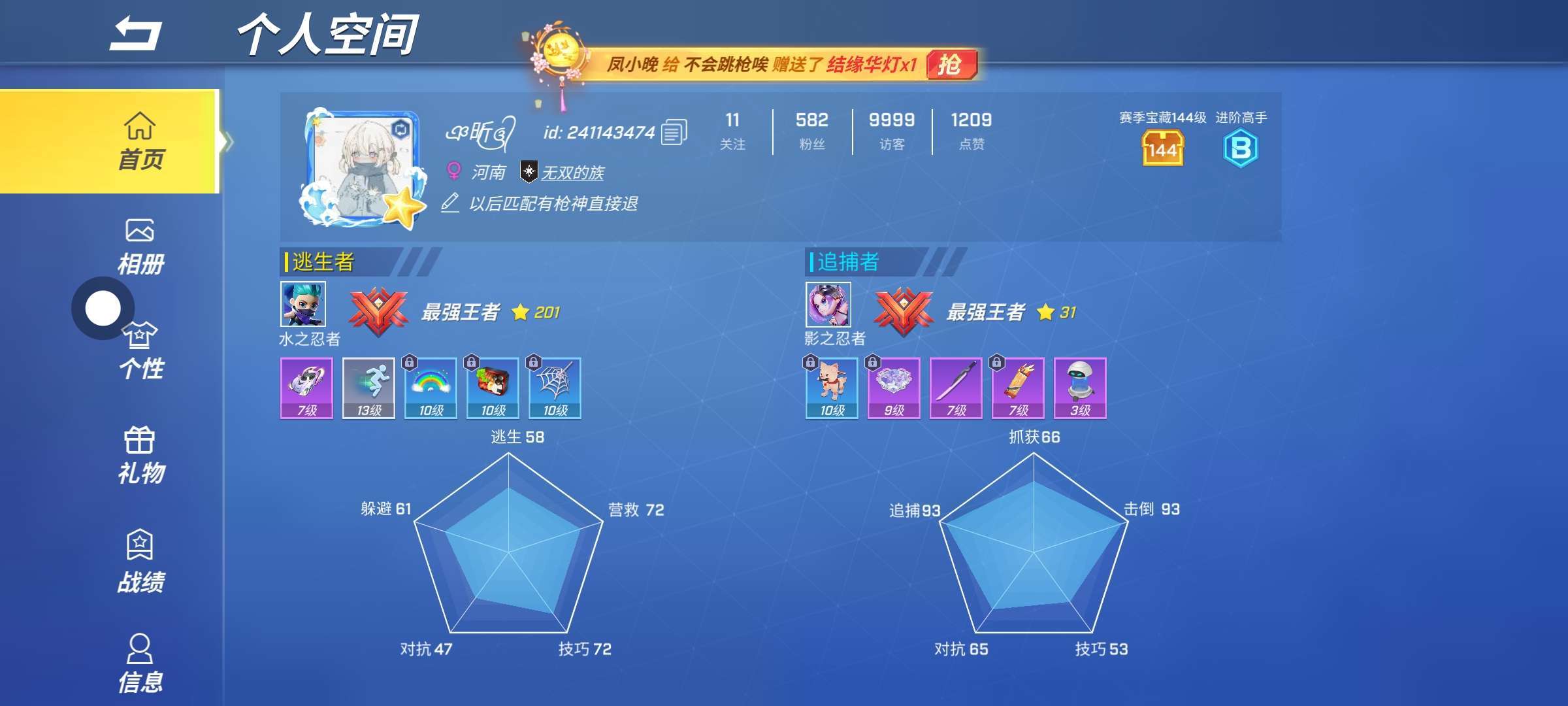 卡组主要为:换风标,追踪雷,医疗包,飞爪和酒桶。锁追踪雷,医疗包和飞爪。这个卡组是我个人觉得比较好使(不喜勿喷),如果觉得医疗包不好使的话,也可以换成治疗球,而我推荐这个卡组,也有一定的原因。首先,众所周知,幽研,这个角色有一个特性,就是使用主动技能,能使对方变成一个蝴蝶,而且使用一些控制性道具卡,例如酒桶和手雷,也是有几率能使对方变成蝴蝶(这个主要是看角色上方的进度条)。而我推荐的这个卡主要用于独自开门和辅助开门,且前期也有一定的操作空间,能用极少的经济逃跑,运用卡组进入对局后主要有以下的思路:可以优先前往左上开锁,一般追捕开局都会去选择去下锁,这个时候就要注意看小地图,如果对面去了下锁,且队友在下面注意,队友的血条和对面与队友的距离,队友血条不对,且离对面极近就可以转去右边开锁了,在转右边的过程中,有几率刷到箱子,如果在左上至右上,有箱子可以优先开箱子,没箱子可以去右下,一般路中间不刷右下锁,就一定会刷,至于为什么不去开右上锁,而是去开下,首先对面抓完左下,上左上抓到人后必定会传送到右上(常规思路),而你在右下,如果刷到了箱子,经济差不多开完来到400~500,稍微开一点锁的进度有红光就变道具,可以选择往右边跑,切记不要贪锁,保留经济开门,红光走了后,稍等一两秒再开锁,但如果对面发现你可利用主动技能给控逃跑,尽量不要花费经济,开完右下后,一般这个时候队友如果不坑人的话,已经二锁破了,如果你没有耗费经济,差不多已经,有八九百的经济,然后就可以去备门了,先买一个250的武器把酒桶刷出来,上门下门都可以,放一个追踪雷,然后三所破完后直接开,对面如果传送过来,离得远,给一个酒桶,离得近的话,可以等追踪雷打到他身上再扔酒桶,但如果是劲凯影之忍者,不要犹豫直接给,(当然,如果对面是女特工,机器人还是等队友一块开)过程中如果对面有生命护盾解控,可以用换风标进行干扰,换风标有一定击退效果,且不会断门,切记不要用主动用主动会断门,开完门后可以选择打追捕或直接飞爪进门(还有这边提醒要贴门,不要侧贴容易断),如果是队友一块开门的话,可以选择先放追踪雷,对面传过来的话,飞爪加酒桶,利用武器打对面伤害不够秒升二级打(所以说这里劝大家不要对面不在就用升武器)但是如果队友特别坑的话,就全当我别说,毕竟,再好的卡组,再强的人,遇到再坑的队友,也是会输的😒。这边再说一下,如果对面开局去了左上的思路,要注意红光,这边建议大家上墙后锁上开,可以及时观察对面动态,如果过来给控,一般来说,即使对面过来开局,时间也够开局开一个完美,经济150左右,给完后可以往回撤,过程如果对面没被控到直接飞爪跑,被抓到的话…(看队友了队友不救凉拌救了还行(›´ω`‹)),队友,如果把你救了的话,参考上面的思路继续。好了,介绍到这里就完了,真的,我介绍这个卡组,主要也是希望幽研玩家开开心心地玩好,每一局游戏,也希望指绘师幽研这个角色能逐渐出现在大众的视野里,这边再次祝幽研玩家们天天开心Σ(|||▽||| )。(不喜欢的千万一定不要不要不要不要不要喷我(。•́︿•̀。))