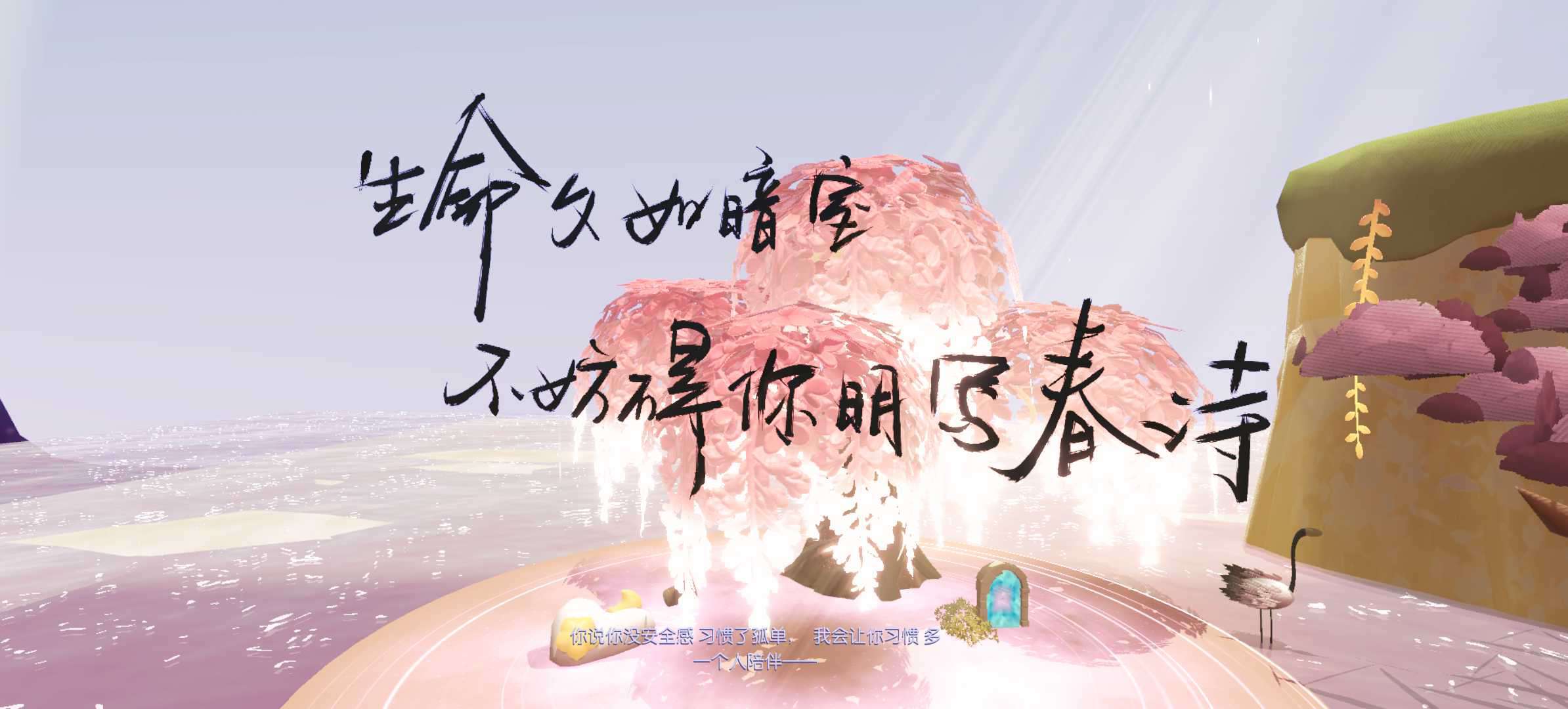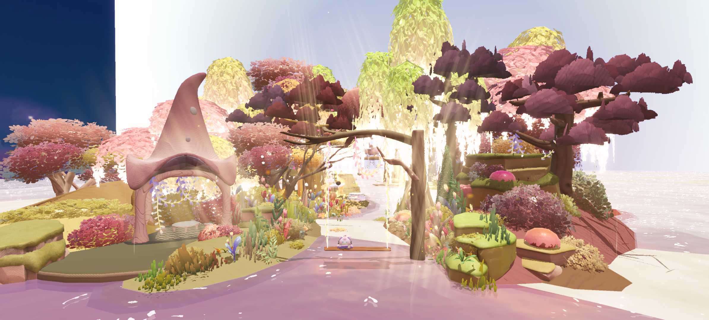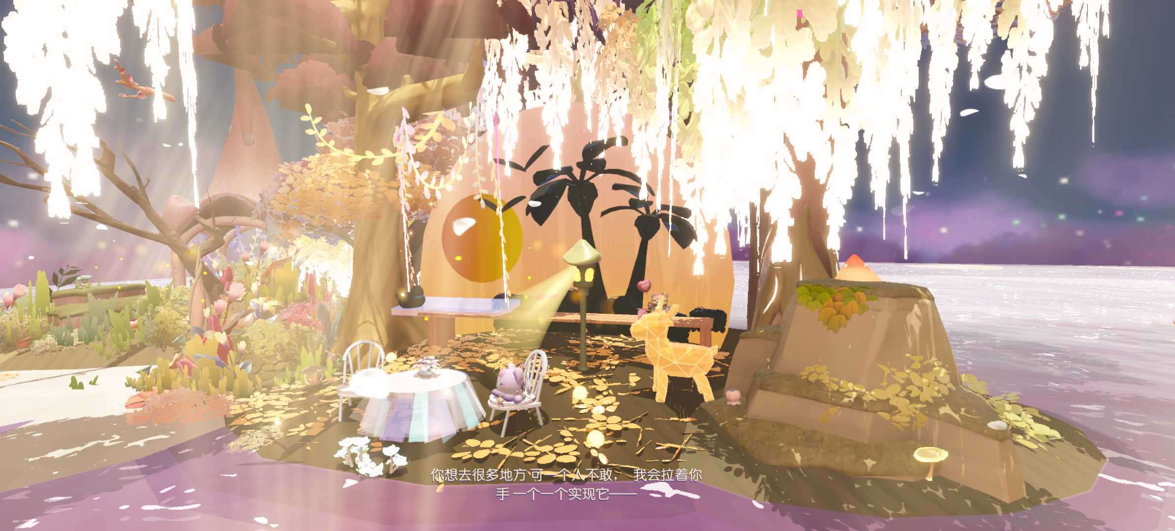 有了春天当然也不能少了秋天呀~落叶凋零,这张就是秋天很好的代表性,这张图整体看起来很有氛围感,往里走,中间有一个超级大的秋千,往里走,有着下午茶的小桌子和椅子,像极了一个小花园,在这里,你可以和你的蛋搭子一起喝下午茶,再往里走有着一架水晶钢琴,钢琴的旁边还有地图的歌词,这里适合在秋天的时候野餐。