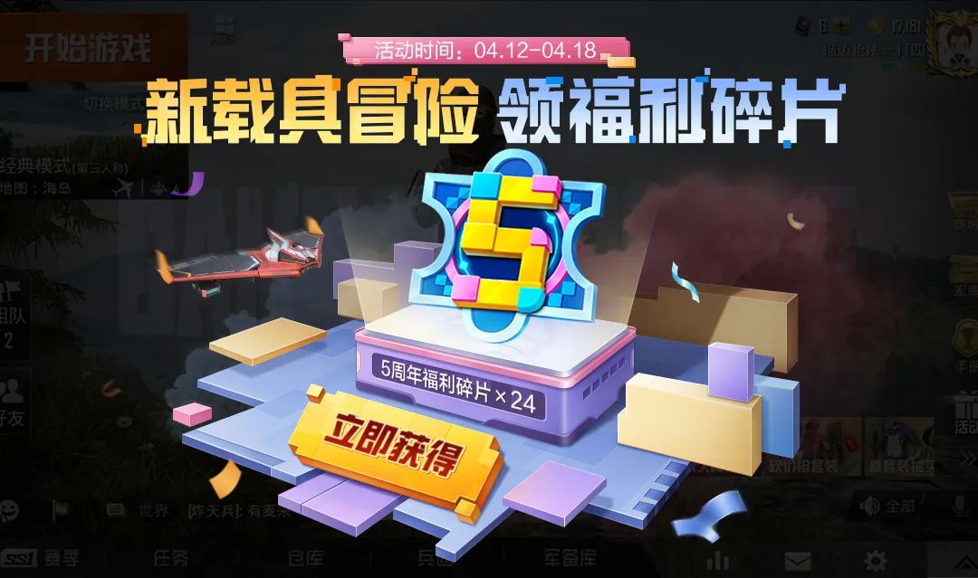 全新活动上线,4月12日-4月18日,参与新载具冒险小游戏,成功躲避信号塔、热气球等障碍物,顺利前进就能获得对应积分,根据积分进度累计可获得5周年福利碎片×24。