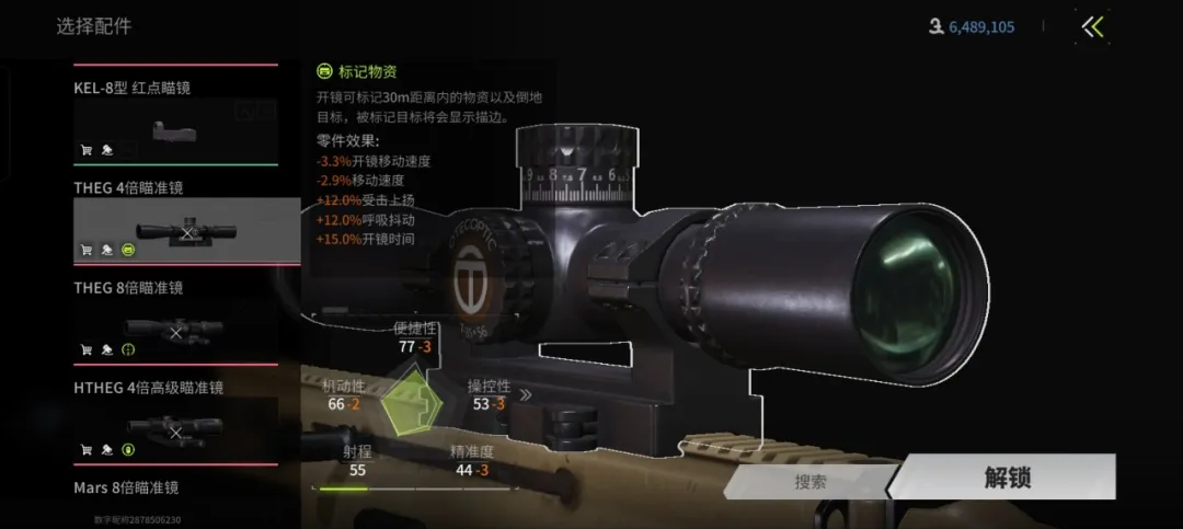 瞄具大家可以选用HTHEG 4倍瞄准镜,具备四倍缩放功能,特别之处在于其独特的战斗类效果。在烟雾或毒气中,视线受阻时,这款瞄准镜能标记敌方,并显示其血条信息,持续五秒,让敌人无处遁形。十字型准星和易用瞄准界面,增强了战斗能力,更利于发现敌人。