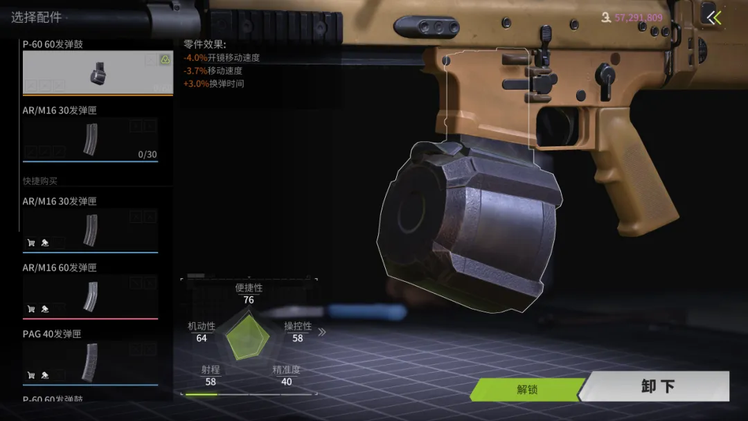 弹夹我们选用P-60 60发弹鼓或AR/M16 60发弹匣这两个均为大容量的弹夹配件,能为我们的实战提供更高的容错率。P-60弹鼓主要减少移动速度,比较适合搭配我们的榴弹发射器架点使用。AR/M16弹匣增加的开镜时间较多,适合我们在近距离使用腰射作战。
