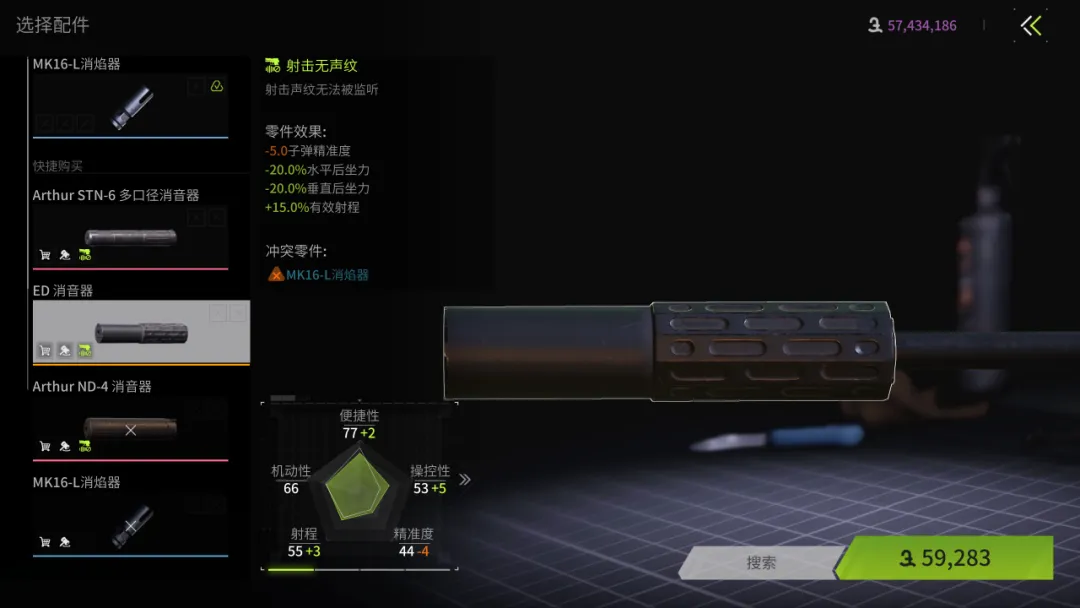 枪口选择ED消音器,降低20%的后座,增加15%的射程,同时射击声纹无法被监听,虽然减少了精准度,但让这把武器的有效杀伤距离变大。