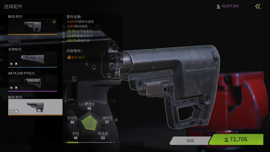枪托选择BUS枪托,它能减少较为可观的后坐力,还能为我们提供大额的屏息时间,适合我们中距离开镜压枪作战。