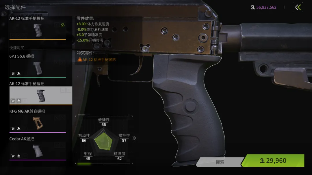 后握方面选择AK-12 标准手枪握把,这是陌上个人感觉整个游戏最实用的握把,不仅价格低廉,还能提供大额的全能属性,实用性拉满的一个后握把。