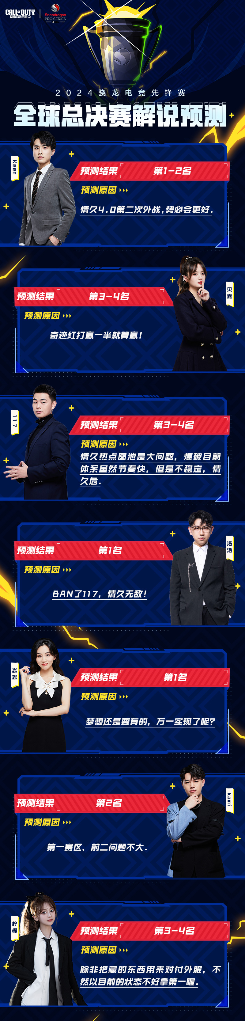 骁龙电竞先锋赛·全球总决赛4月13日就要开赛啦,瘦普激动地难以入睡,时刻准备着为国服情久战队加油助威!对于本次比赛情久战队最终将获得第几名,大师赛的解说们悄悄做了预测...一起来看看吧~