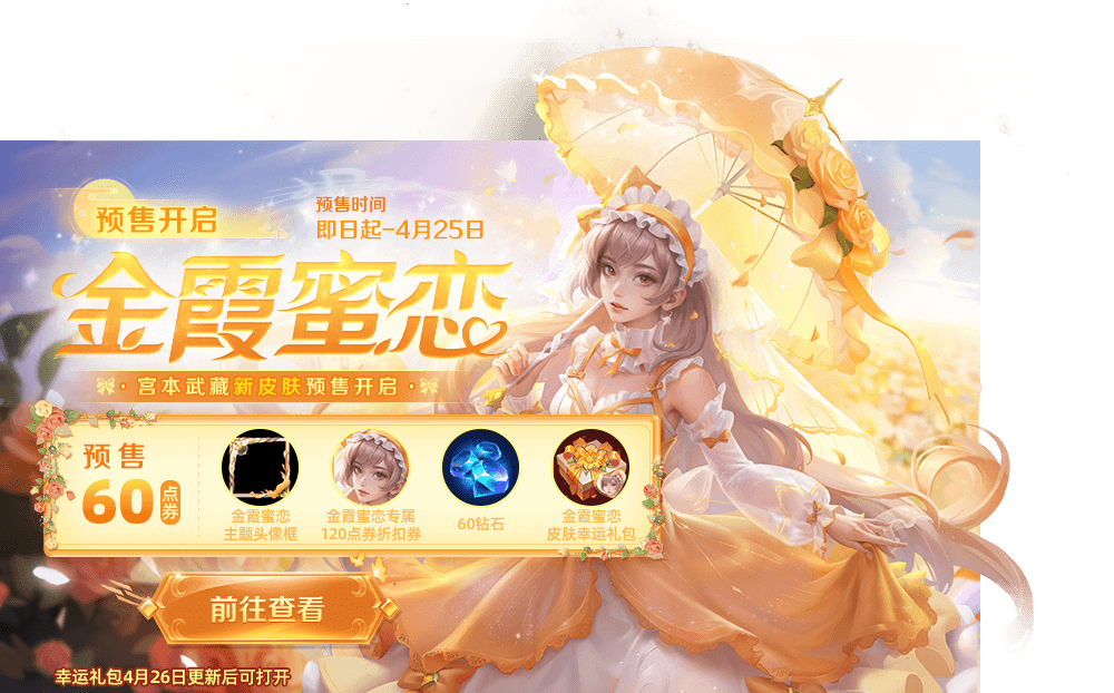 花费60点券即可获得金霞蜜恋主题头像框、金霞蜜恋专属120点券折扣券、60钻石、金霞蜜恋皮肤幸运礼包!