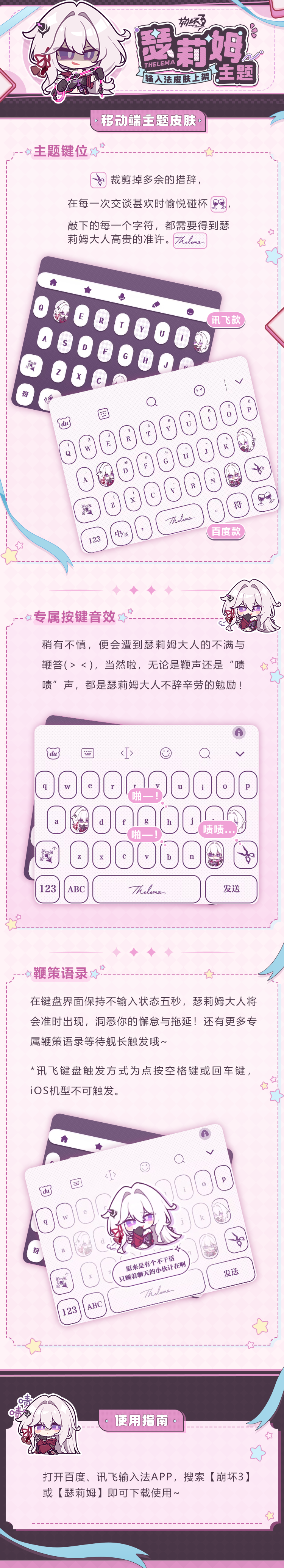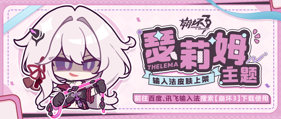 舰长好~《崩坏3》瑟莉姆主题输入法皮肤现已上架!内有主题键位、专属按键音效、瑟莉姆鞭策语录等待解锁哦!舰长前往百度、讯飞输入法APP搜索【崩坏3】或【瑟莉姆】即可下载使用~