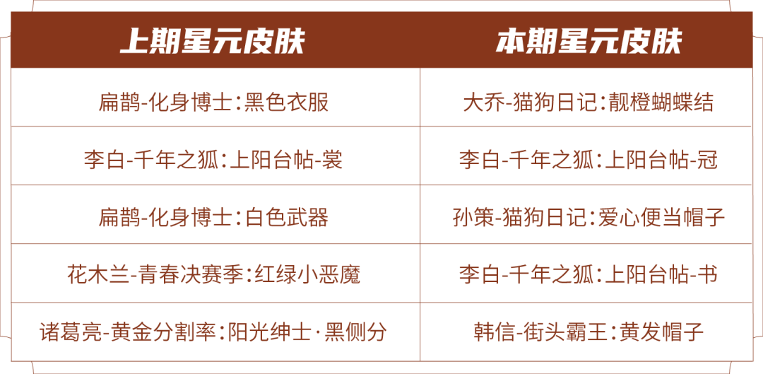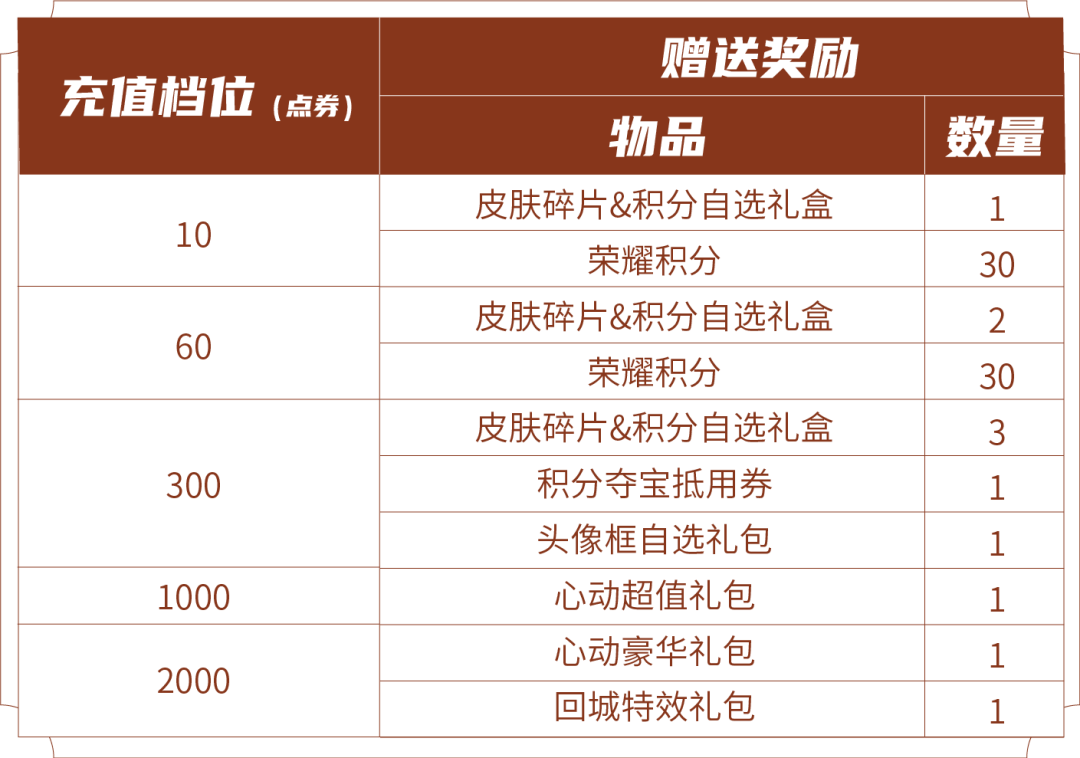 ♏︎皮肤碎片&积分自选礼盒:打开礼包可任意选择以下奖励之一:荣耀积分*10或皮肤碎片*1