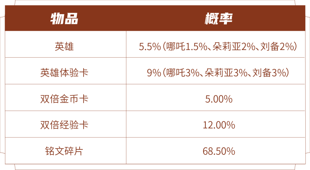 打开后可随机获得以下奖励之一:哪吒、朵莉亚、刘备、英雄体验卡3天、双倍金币卡:1日、双倍经验卡:1日、188/138/108铭文碎片。