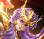 米罗身穿金光闪闪的天蝎座黄金圣衣,一头紫色长发搭配天蝎座圣衣经典的黄金头盔 ,头盔上的辫饰即为蝎子的尾巴,霸气十足。