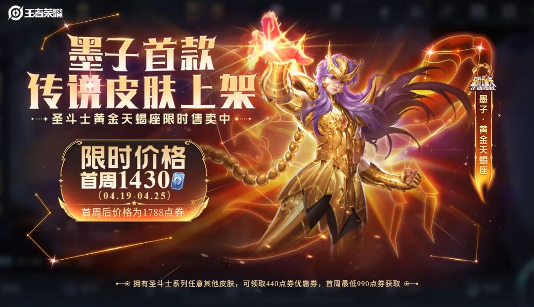 ♏︎首周价格:1430点券,首周后1788点券(若拥有圣斗士系列任意其他皮肤,可在活动领取440点券墨子-黄金天蝎座优惠券,首周最低990点券获取)