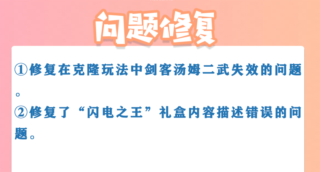 1. 修复在克隆玩法中剑客汤姆二武失效的问题。