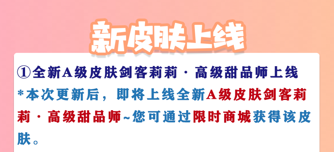 *本次更新后,即将上线全新A级皮肤剑客莉莉·高级甜品师~您可通过限时商城获得该皮肤。
