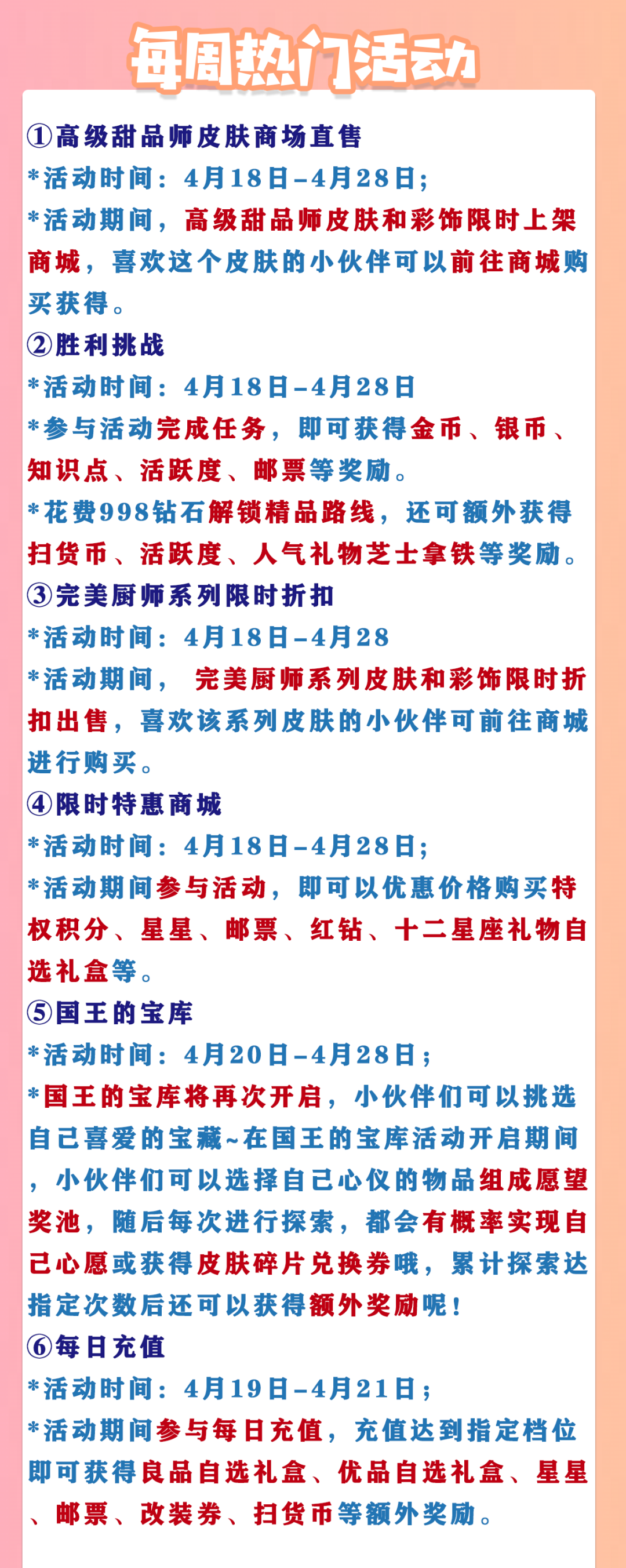 *国王的宝库将再次开启,小伙伴们可以挑选自己喜爱的宝藏~在国王的宝库活动开启期间,小伙伴们可以选择自己心仪的物品组成愿望奖池,随后每次进行探索,都会有概率实现自己心愿或获得皮肤碎片兑换券哦,累计探索达指定次数后还可以获得额外奖励呢!