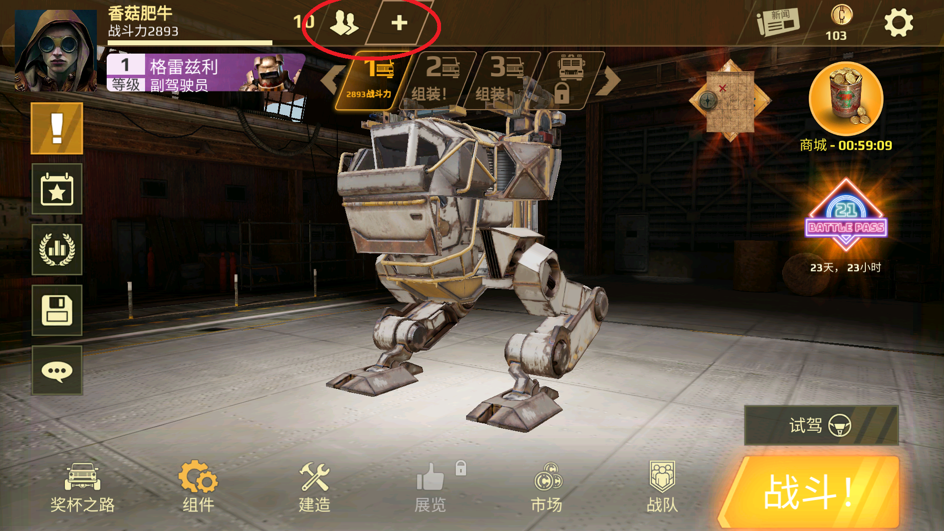 首先,让我们返回车库界面,在游戏界面左上角是个人档案,在个人档案旁边,红圈标注处就是好友列表和添加好友的快捷按钮。