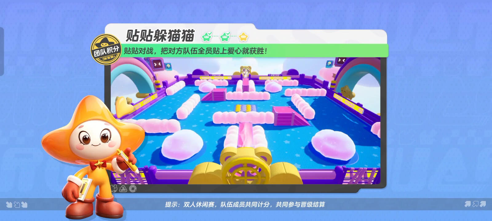 星妹今天带来的【贴贴躲猫猫】是一张团队积分赛地图。在这张地图里,星宝们将被分为红、蓝两个小队,率先把对方全队都贴上爱心的队伍才能取得胜利喔!